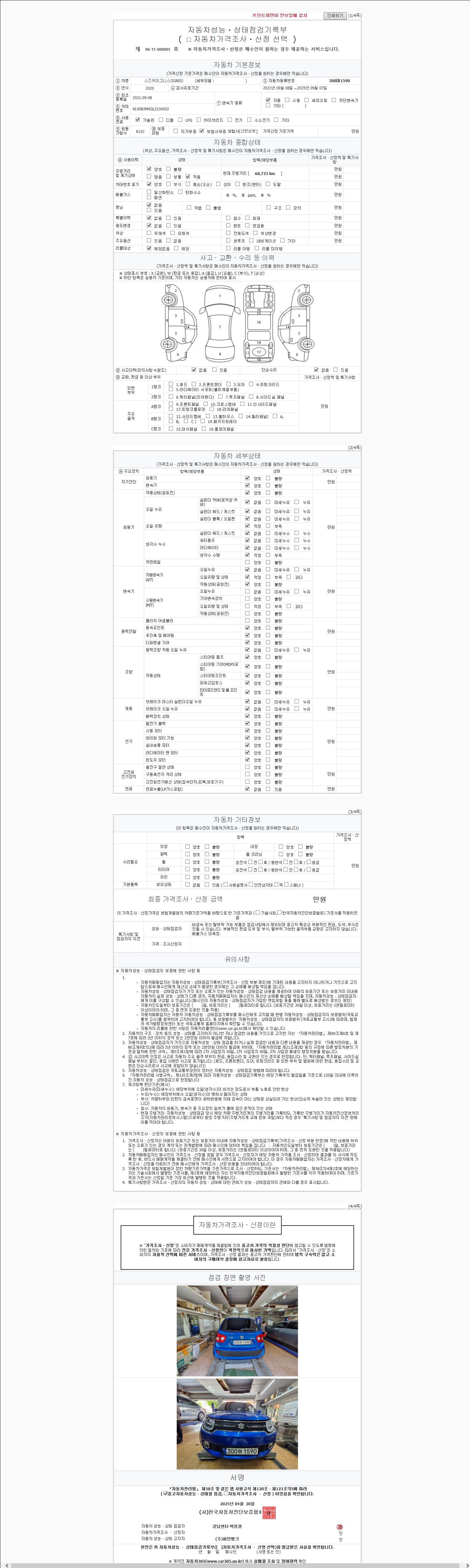 | 주행거리 | 68,723 km | 차량번호 | 300머1590 | 사고유무 | 성능기록부 참조 | 제시번호 | 제 2025048585 호 |