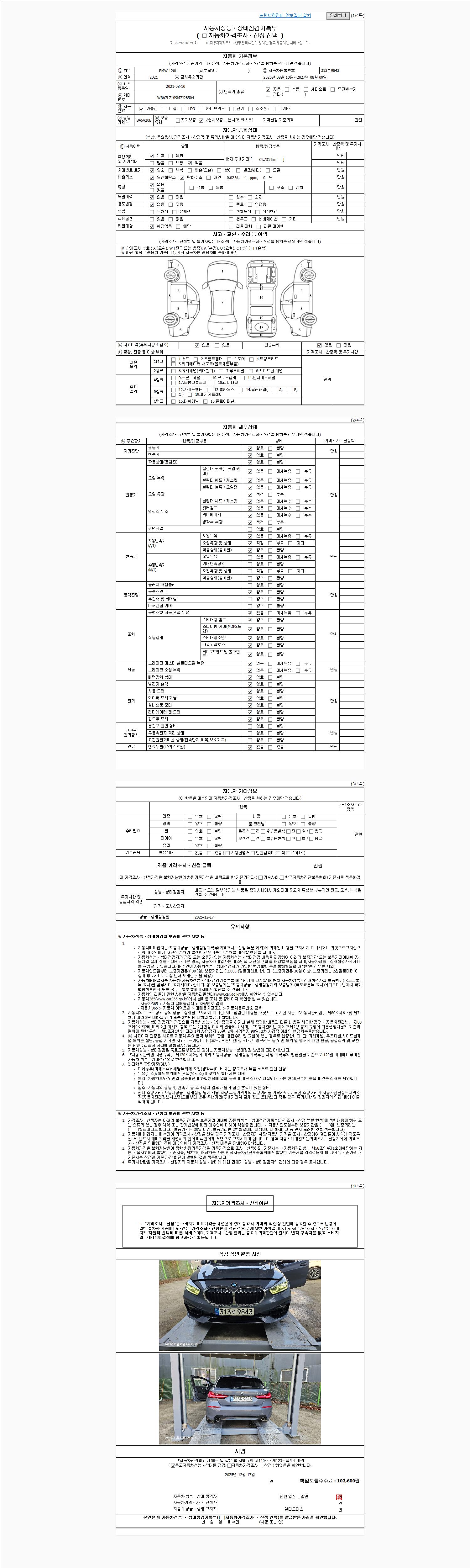 자동차관리법 시행규칙 제120조의 규정에 따라 별지 제 82호서식 《중고자동차 성능, 상태점검 기록부》를 발행한 성능, 상태점검자 및 매매자는 아래의 보증기간 또는 보증거리 이내의 중고자동차, 성능점검 기록부에 기재된 내용과 자동차의 실제 성능, 상태가 다른 경우 계약 또는 관계법령에 따라 매수인에 대하여 책임을 집니다.