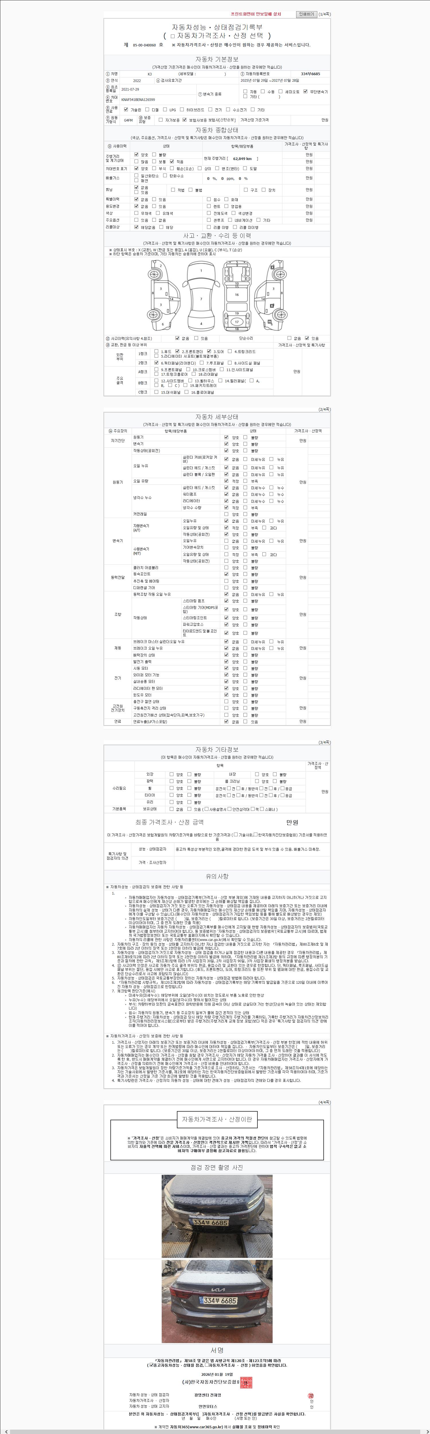 | 주행거리 | 62,849 km | 차량번호 | 334부6685 | 사고유무 | 성능기록부 참조 | 제시번호 | 제 2147483647 호 |