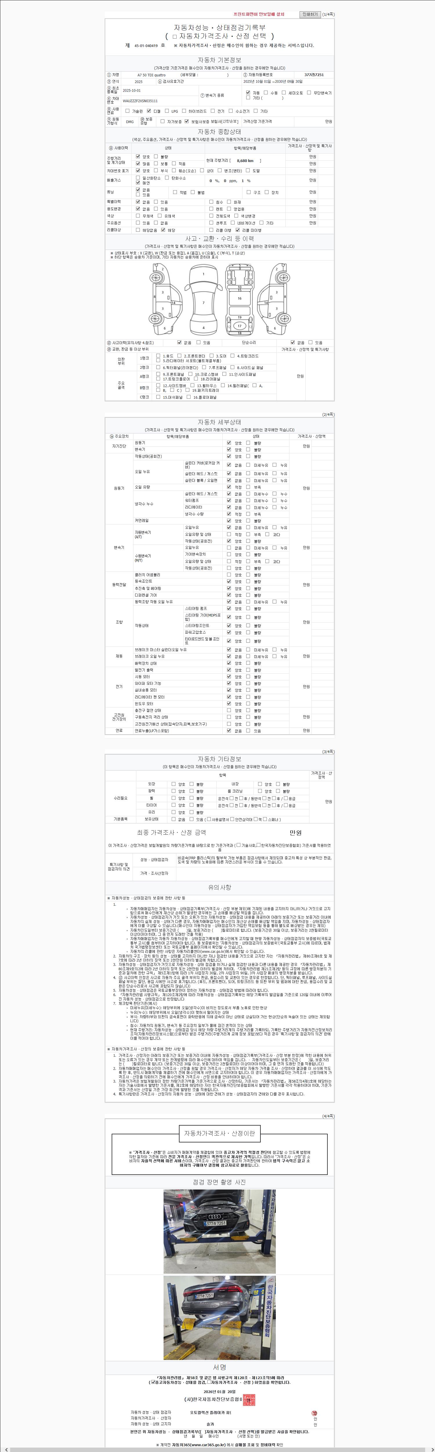 -중고자동차 매매업자를 통해 차량을 구입하실 경우 반드시 "중고자동차 성능, 상태점검 기록부"를 교뷰 받으셔야 하며, 매매업자는 반드시 의무 교부 하여야 압니다.