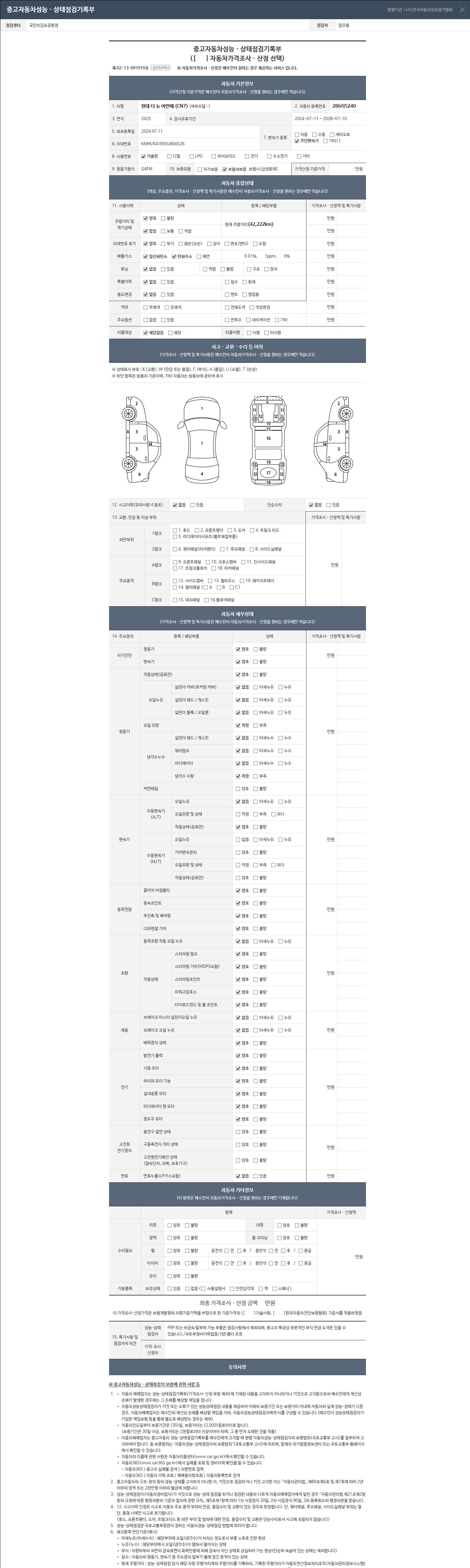 | 주행거리 | 42,285 km | 차량번호 | 286러5240 | 사고유무 | 성능기록부 참조 | 제시번호 | 제 2026029468 호 |