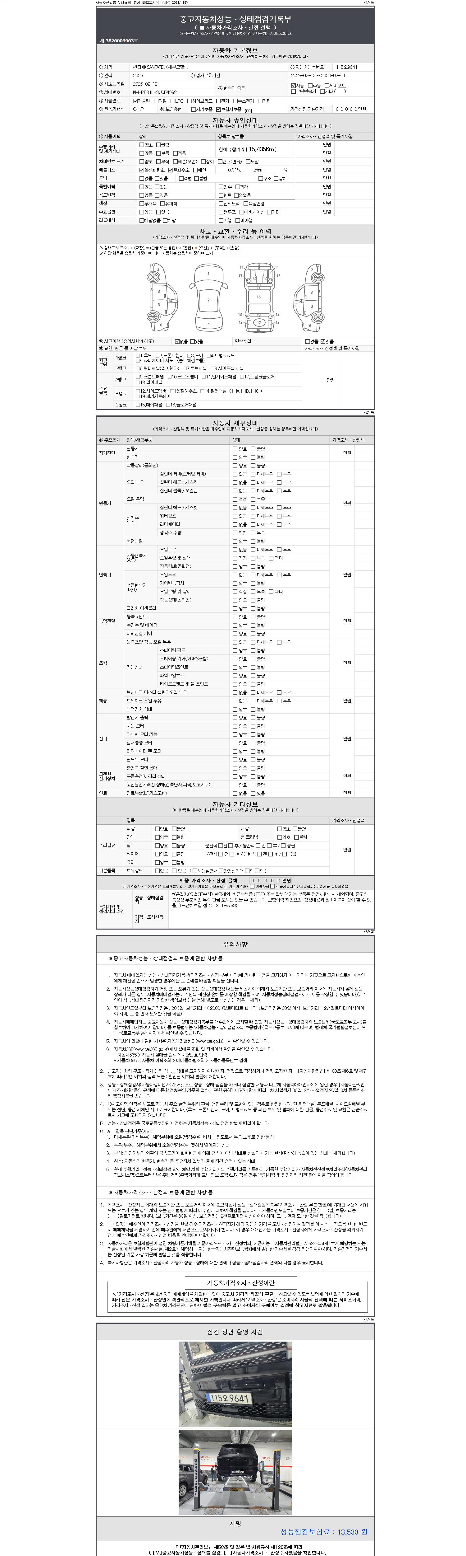 | 주행거리 | 15,435 km | 차량번호 | 115오9641 | 사고유무 | 성능기록부 참조 | 제시번호 | 제 2147483647 호 |