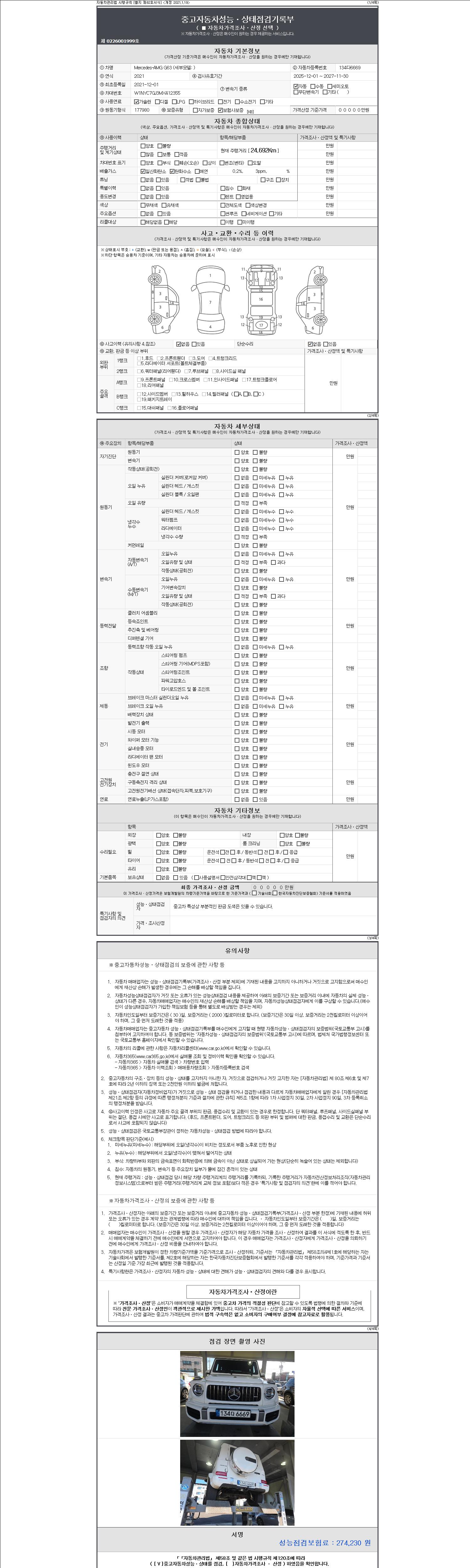 주행거리 24,692 km 차량번호 134다6669 사고유무 성능기록부 참조 제시번호 제 2147483647 호
