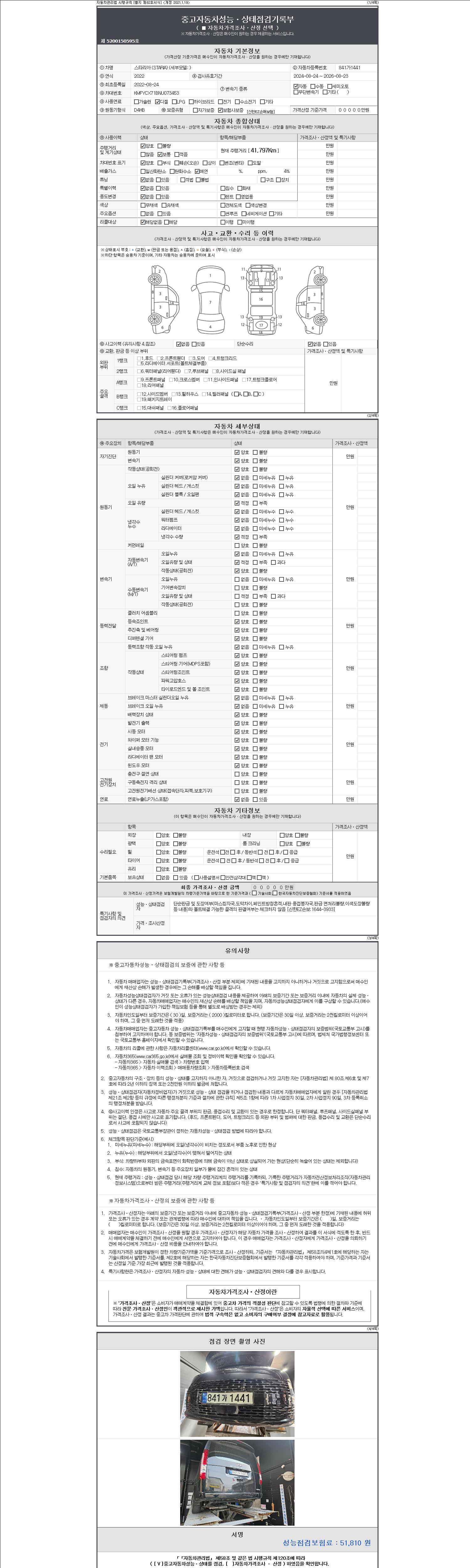 | 주행거리 | 41,797 km | 차량번호 | 841가1441 | 사고유무 | 성능기록부 참조 | 제시번호 | 제 2147483647 호 |