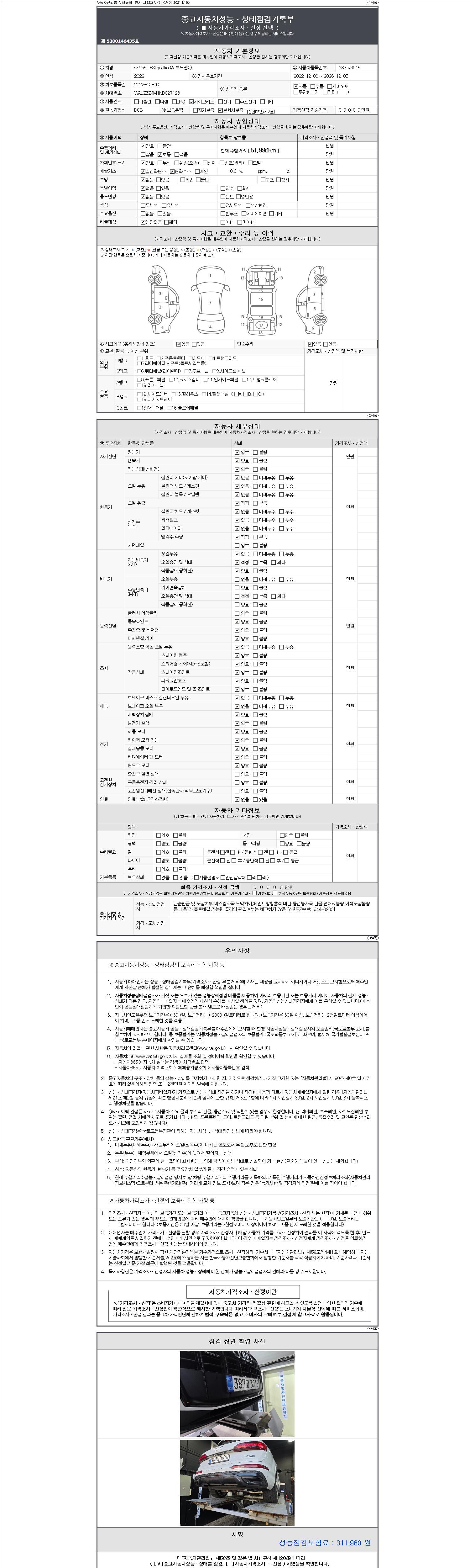 자동차관리법 시행규칙 제120조의 규정에 따라 별지 제 82호서식 《중고자동차 성능, 상태점검 기록부》를 발행한 성능, 상태점검자 및 매매자는 아래의 보증기간 또는 보증거리 이내의 중고자동차, 성능점검 기록부에 기재된 내용과 자동차의 실제 성능, 상태가 다른 경우 계약 또는 관계법령에 따라 매수인에 대하여 책임을 집니다.