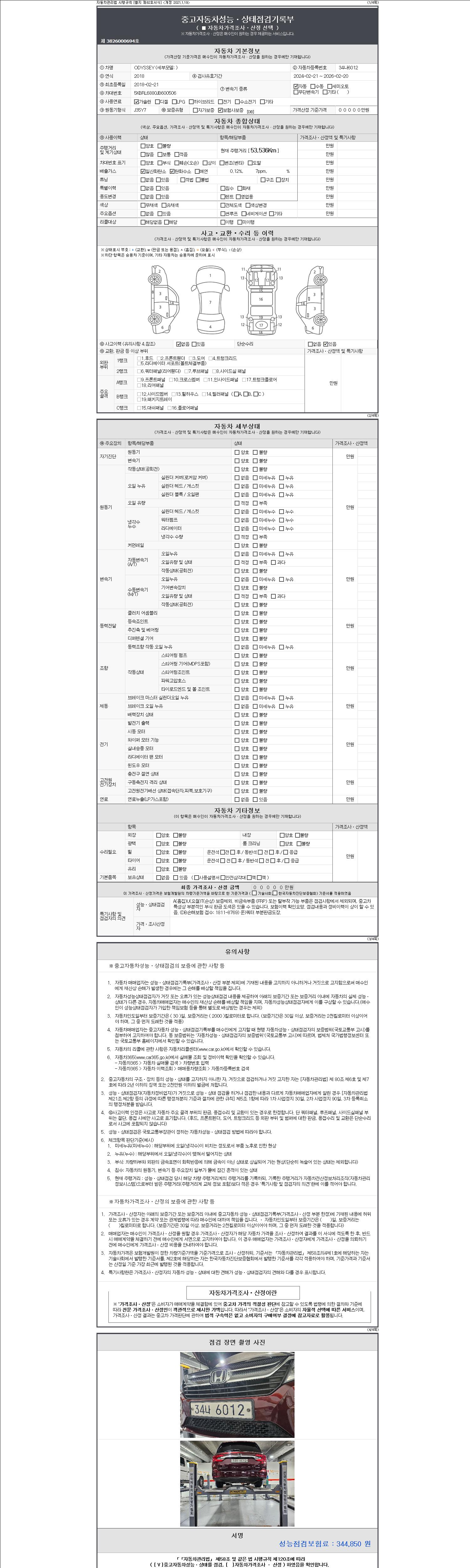 | 주행거리 | 53,536 km | 차량번호 | 34나6012 | 사고유무 | 성능기록부 참조 | 제시번호 | 제 2147483647 호 |