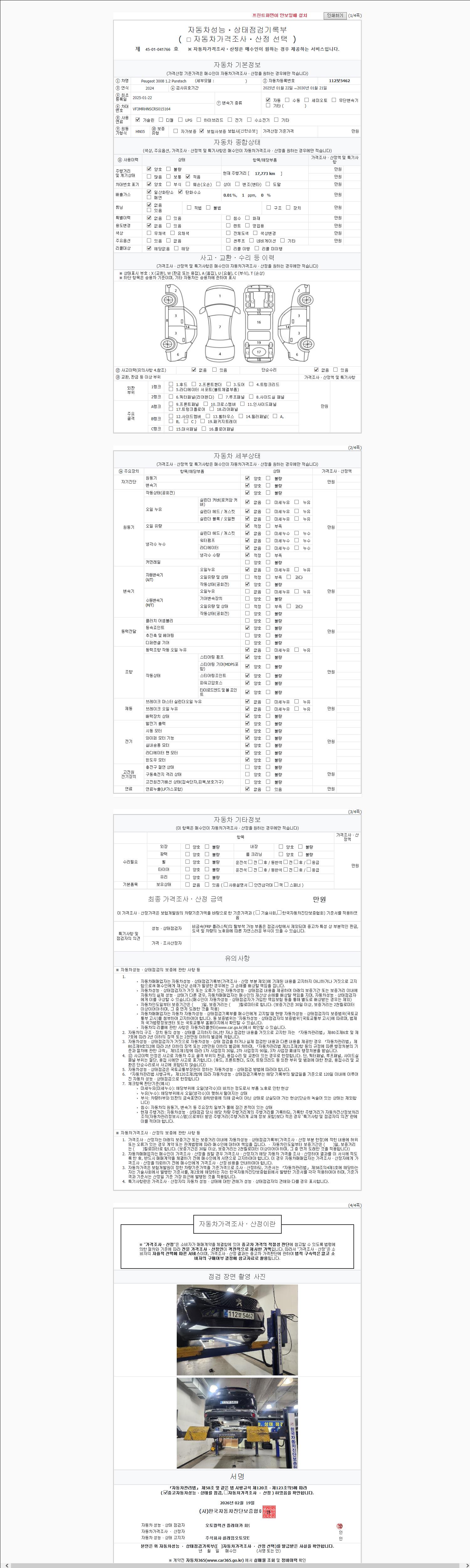 자동차관리법 시행규칙 제120조의 규정에 따라 별지 제 82호서식 《중고자동차 성능, 상태점검 기록부》를 발행한 성능, 상태점검자 및 매매자는 아래의 보증기간 또는 보증거리 이내의 중고자동차, 성능점검 기록부에 기재된 내용과 자동차의 실제 성능, 상태가 다른 경우 계약 또는 관계법령에 따라 매수인에 대하여 책임을 집니다.