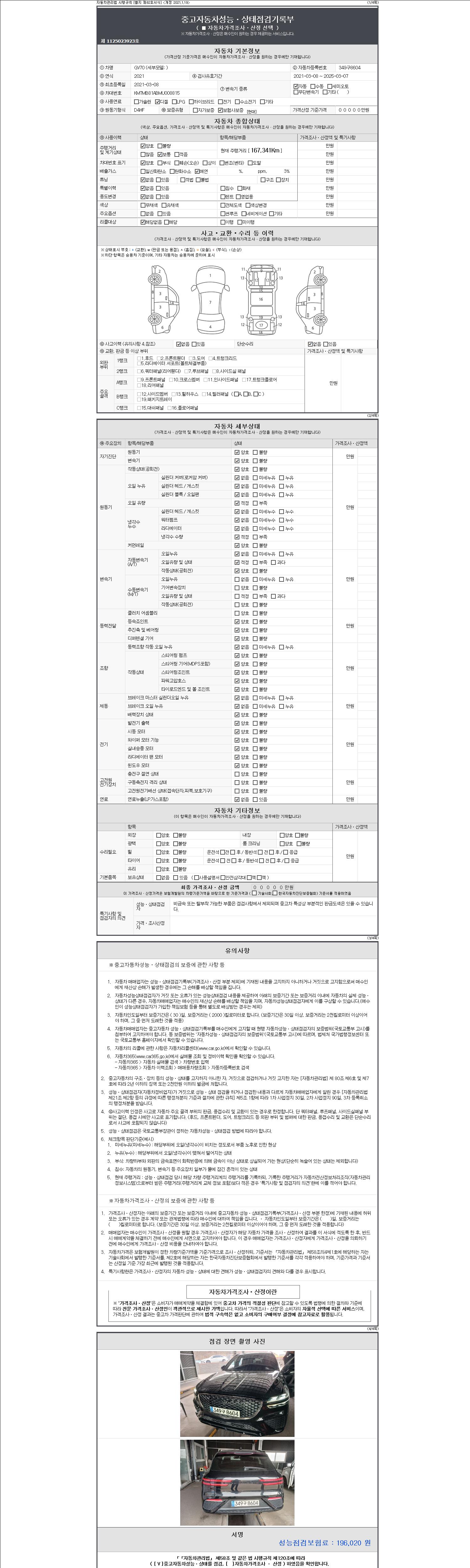 | 주행거리 | 167,341 km | 차량번호 | 349구8604 | 사고유무 | 성능기록부 참조 | 제시번호 | 제 2147483647 호 |