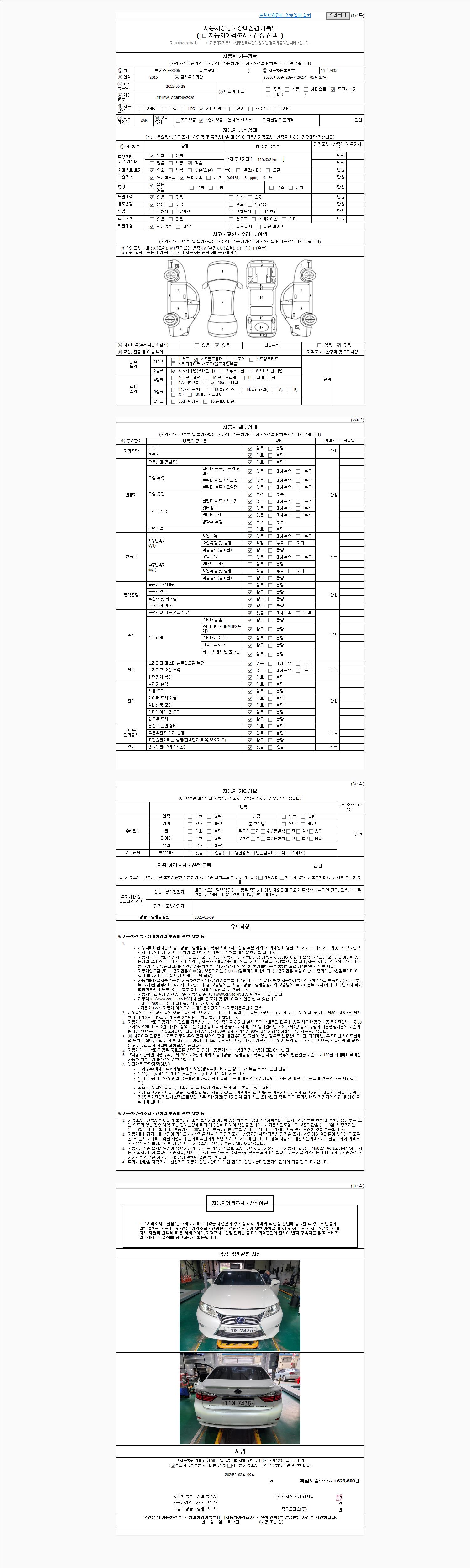 | 주행거리 | 115,352 km | 차량번호 | 11어7435 | 사고유무 | 성능기록부 참조 | 제시번호 | 제 2026012223 호 |